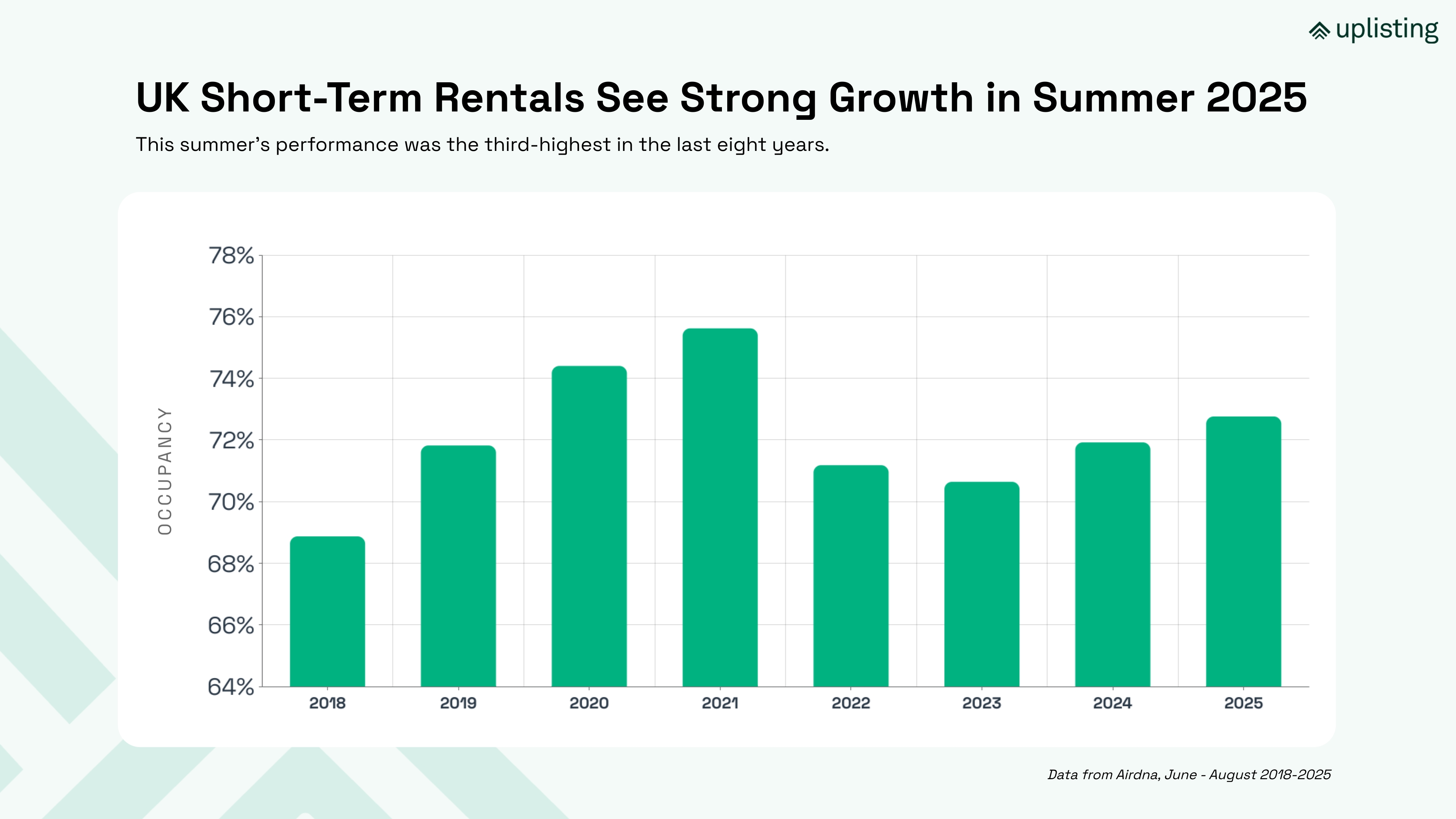 Summer 2025 was a strong season for vacation rental managers in the United Kingdom. Occupancy for entire-home listings averaged 73.8%, up from 71.9% in 2024. That lift was driven by both a 5% increase in nights sold and a 3.8% increase in supply, according to AirDNA.