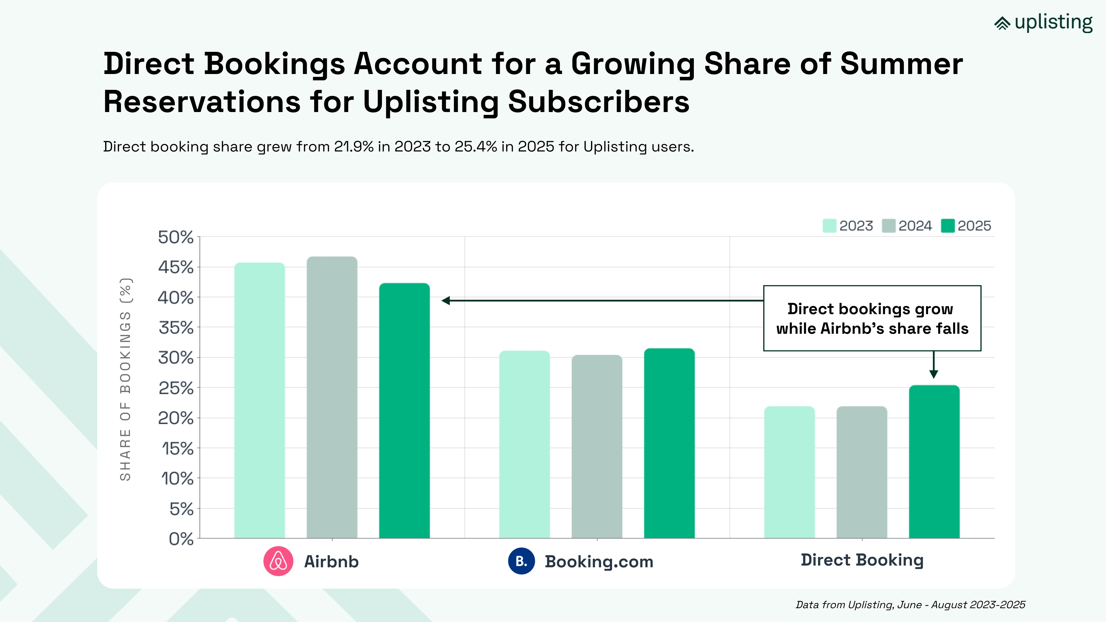 Direct bookings typically mean lower commission costs, more control over the guest experience, and stronger repeat guest potential. For Uplisting subscribers, the shift toward direct reservations is a sign of stronger brand-building and smarter channel management.