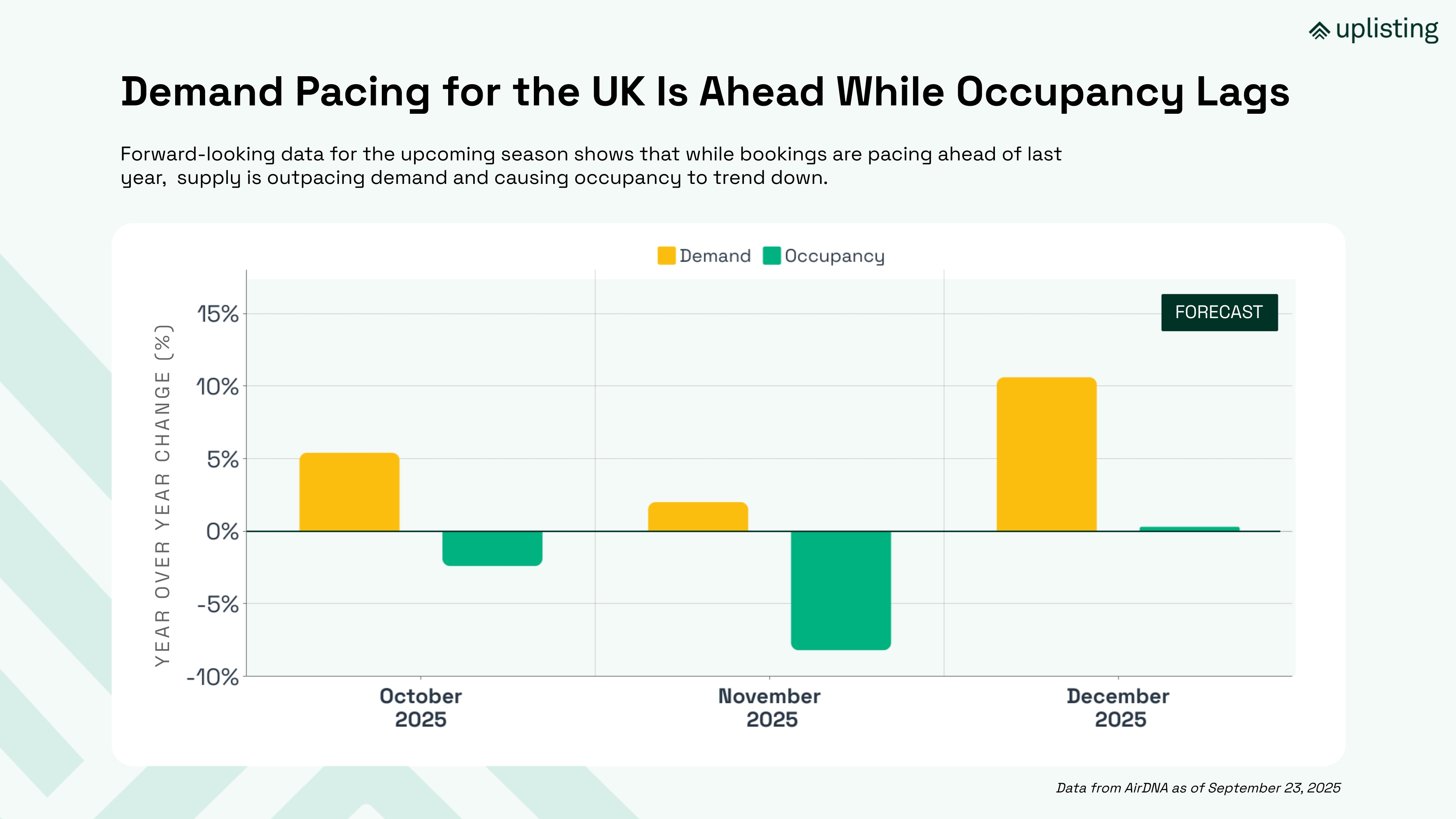 Looking ahead, demand for short-term rentals in the UK is trending higher than 2024. However, occupancy tells a different story. Supply is growing even faster than demand, which is pushing occupancy rates down.