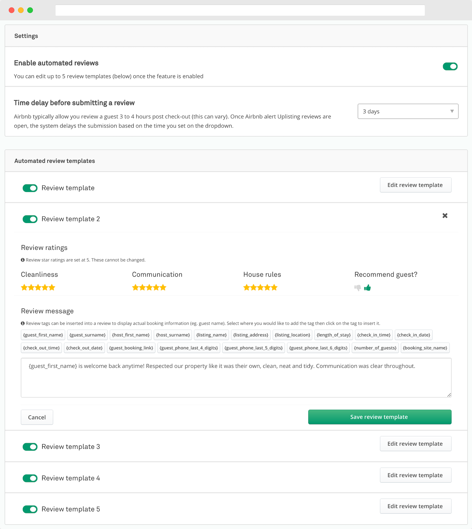 Create your message templates for different scenarios. Create a special automated message for a first-time guest or tailor templates by function, whether for booking confirmations or check-out instructions. Include dynamic fields that automatically populate with guest names, booking details, and property information.